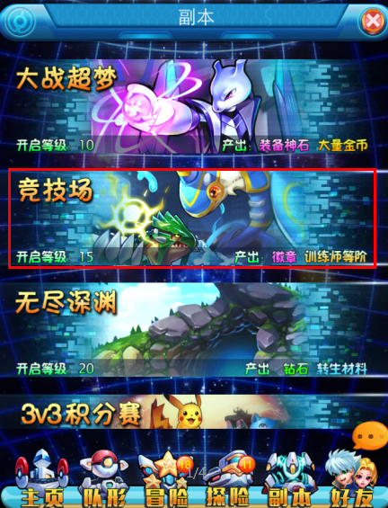《去吧皮卡丘》在玩家到达15级开启竞技系统,训练师可以参加与其他玩家PK,体验不一样的游戏乐趣。每天一共有15次的竞技次数,当次数消耗完之后,可以消耗一定量的钻石购买竞技次数(竞技次数也会自动恢复,每个半小时恢复一次),VIP等级越高,可购买的次数越多,购买消耗的钻石数会递增。