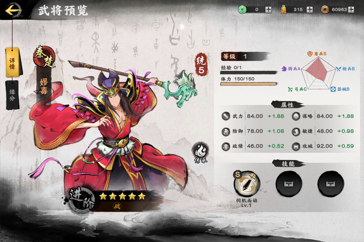 《秦皇汉武》是广州米壳信息科技有限公司推出的一款以秦汉三国等多个朝代为背景的模拟经营类策略手游,游戏用还原度超高的大地图,极具东方美学的水墨画风和沉浸式的历史剧情为玩家徐徐展开一幅横跨秦汉四百年时间的精美绘卷!游戏中玩家将化身为秦汉时期的一方城主,在烽烟四起的动乱年代之中,招兵买马、大兴土木、建设城池来壮大自身,在这乱世谋得一处立足之地并以此为根据,开荒拓土,最终一统天下!游戏在传统SLG的基础上加入了全新的角色养成系统和策略战斗系统,玩家需要招募名将,通过千变万化的技能搭配,组建极具个人色彩的势力,开疆拓土!主公,如今天下局势混乱,各地势力雄踞一方,都在虎视眈眈,你当积蓄资源,加强城建,伺机而动还是主动出击,开拓领地,以攻代守?