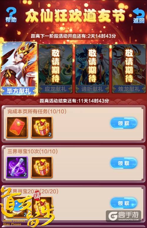 7月11日至7月22日期间,《道友请留步》将连续推出四期幻仙献礼活动。在活动期间,完成相应的任务即可获得众位幻仙为广大玩家带来的礼物。红包元宝以及各类培养材料海量放送,更有道友节专属小礼包神秘登场!快来《道友请留步》和颜值超高的幻仙小姐姐们一起嗨翻天吧!