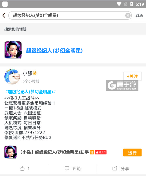 最后,关于此款超级经纪人(梦幻全明星)辅助工具软件如果在使用的过程中有什么不满意的地方或者有需要改进的地方可以关注我们的微信公众号(gaoshouyou)提问或者在下方留言给我们,我们会即时更新并处理。我们会认真对待您的每一条评论,并反馈给脚本作者,以便提升您的游戏质量。