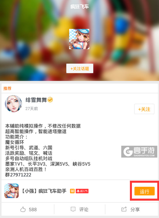 所谓的疯狂飞车辅助工具,其实很好理解,就是通过一些写好的脚本来辅助玩家玩疯狂飞车,切记!不是疯狂飞车外挂!只是辅助疯狂飞车玩家操作的工具!!今天,我们就为大家带来重磅介绍一款高手游和游戏蜂窝联合定制的疯狂飞车辅助工具!