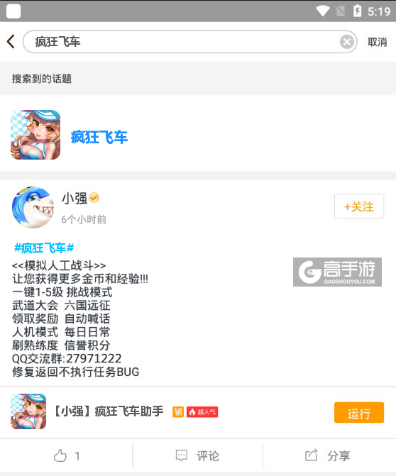 4、切换回首页,在搜索框中搜索“疯狂飞车”,点击疯狂飞车ICON进入疯狂飞车辅助话题页,下方则会出现一系列我们官方工作人员编写的或者官方工作人员审核认证的疯狂飞车脚本,您可以根据自己的需求选择对应的脚本,然后点击运行。如图三图四所示。