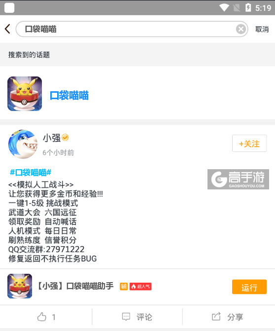 4、切换回首页,在搜索框中搜索“口袋喵喵”,点击口袋喵喵ICON进入口袋喵喵辅助话题页,下方则会出现一系列我们官方工作人员编写的或者官方工作人员审核认证的口袋喵喵脚本,您可以根据自己的需求选择对应的脚本,然后点击运行。如图三图四所示。