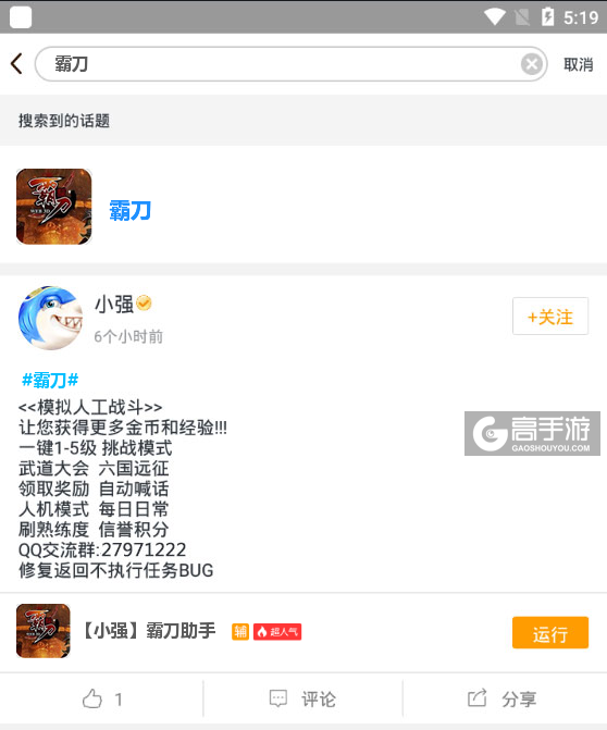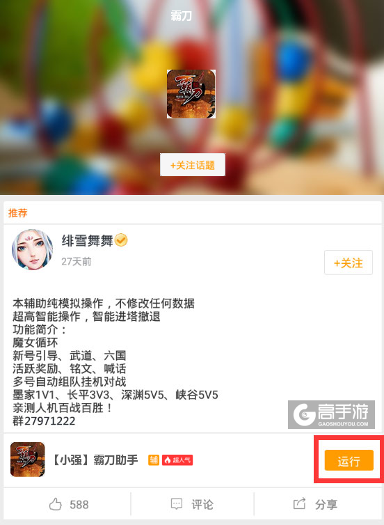 4、切换回首页,在搜索框中搜索“霸刀”,点击霸刀ICON进入霸刀辅助话题页,下方则会出现一系列我们官方工作人员编写的或者官方工作人员审核认证的霸刀脚本,您可以根据自己的需求选择对应的脚本,然后点击运行。如图三图四所示。