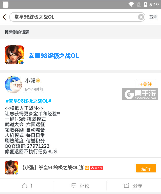 最后,关于此款拳皇98终极之战OL辅助工具软件如果在使用的过程中有什么不满意的地方或者有需要改进的地方可以关注我们的微信公众号(gaoshouyou)提问或者在下方留言给我们,我们会即时更新并处理。我们会认真对待您的每一条评论,并反馈给脚本作者,以便提升您的游戏质量。