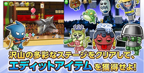 游戏最大卖点让玩家感受到本作极富特色的浮世绘风格菜单的浓浓日本风,采用横版闯关的方式,简直就是忍者版的“马里奥”,玩家通过跳跃攻击等等穿越包围勇往直前。游戏操作也是非常的简单易上手,除了动作游戏固有的紧张感和良好的节奏感以外,游戏最大的一个噱头在于游戏配置了一个玩家可以自己来编辑游戏舞台和怪物的机能!!自己编辑的舞台在游戏里公开,其他玩家也可以在你编辑的舞台里玩,可以进行共享和交流。这确实是非常新鲜的一个玩法!