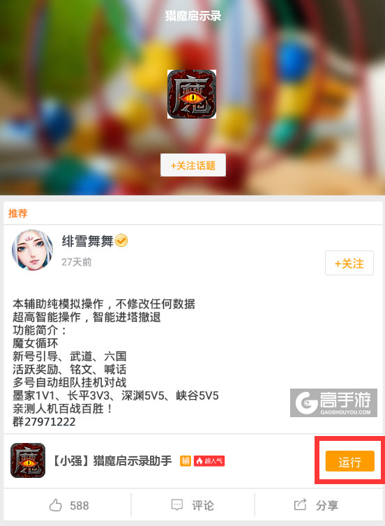 最后,关于此款猎魔启示录辅助工具软件如果在使用的过程中有什么不满意的地方或者有需要改进的地方可以关注我们的微信公众号(gaoshouyou)提问或者在下方留言给我们,我们会即时更新并处理。我们会认真对待您的每一条评论,并反馈给脚本作者,以便提升您的游戏质量。