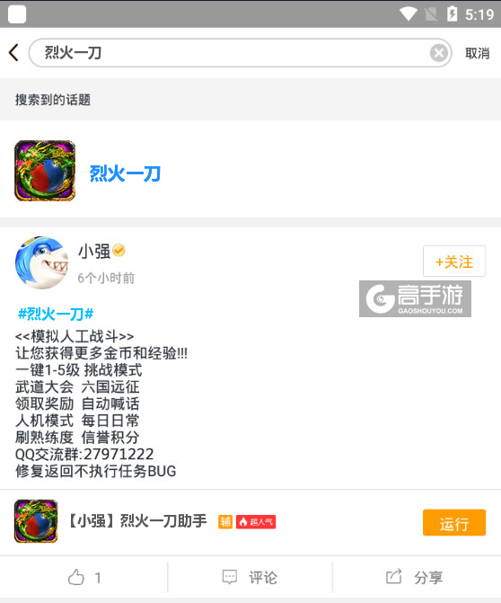 4、切换回首页,在搜索框中搜索“烈火一刀”,点击烈火一刀ICON进入烈火一刀辅助话题页,下方则会出现一系列我们官方工作人员编写的或者官方工作人员审核认证的烈火一刀脚本,您可以根据自己的需求选择对应的脚本,然后点击运行。如图三图四所示。