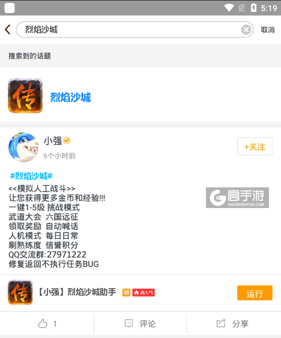 最后,关于此款烈焰沙城辅助工具软件如果在使用的过程中有什么不满意的地方或者有需要改进的地方可以关注我们的微信公众号(gaoshouyou)提问或者在下方留言给我们,我们会即时更新并处理。我们会认真对待您的每一条评论,并反馈给脚本作者,以便提升您的游戏质量。