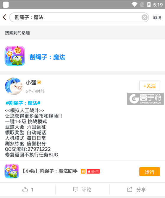最后,关于此款割绳子:魔法辅助工具软件如果在使用的过程中有什么不满意的地方或者有需要改进的地方可以关注我们的微信公众号(gaoshouyou)提问或者在下方留言给我们,我们会即时更新并处理。我们会认真对待您的每一条评论,并反馈给脚本作者,以便提升您的游戏质量。