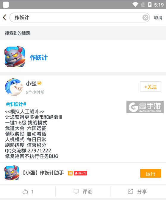 4、切换回首页,在搜索框中搜索“作妖计”,点击作妖计ICON进入作妖计辅助话题页,下方则会出现一系列我们官方工作人员编写的或者官方工作人员审核认证的作妖计脚本,您可以根据自己的需求选择对应的脚本,然后点击运行。如图三图四所示。