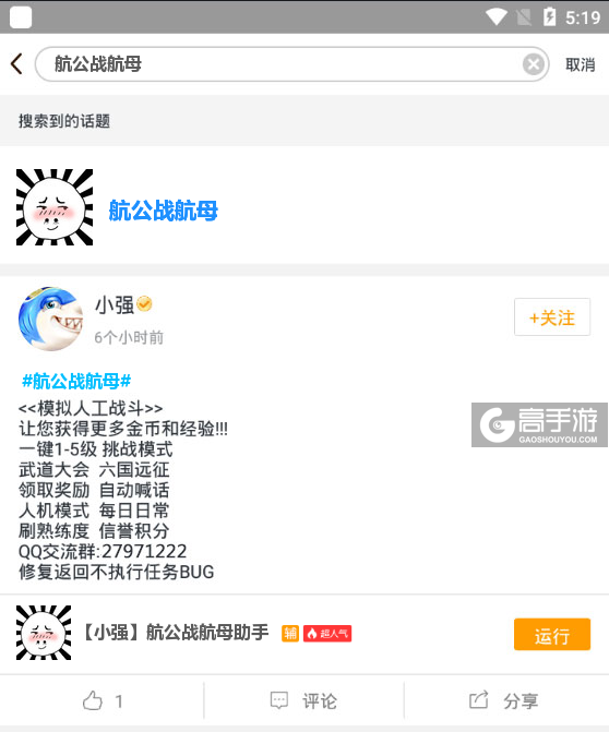 4、切换回首页,在搜索框中搜索“航公战航母”,点击航公战航母ICON进入航公战航母辅助话题页,下方则会出现一系列我们官方工作人员编写的或者官方工作人员审核认证的航公战航母脚本,您可以根据自己的需求选择对应的脚本,然后点击运行。如图三图四所示。