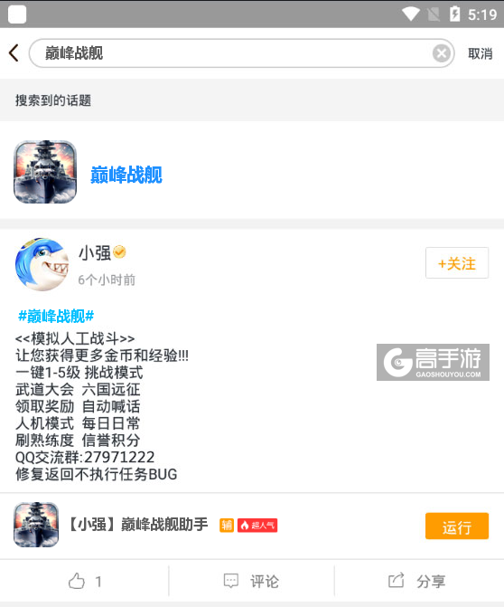 4、切换回首页,在搜索框中搜索“巅峰战舰”,点击巅峰战舰ICON进入巅峰战舰辅助话题页,下方则会出现一系列我们官方工作人员编写的或者官方工作人员审核认证的巅峰战舰脚本,您可以根据自己的需求选择对应的脚本,然后点击运行。如图三图四所示。