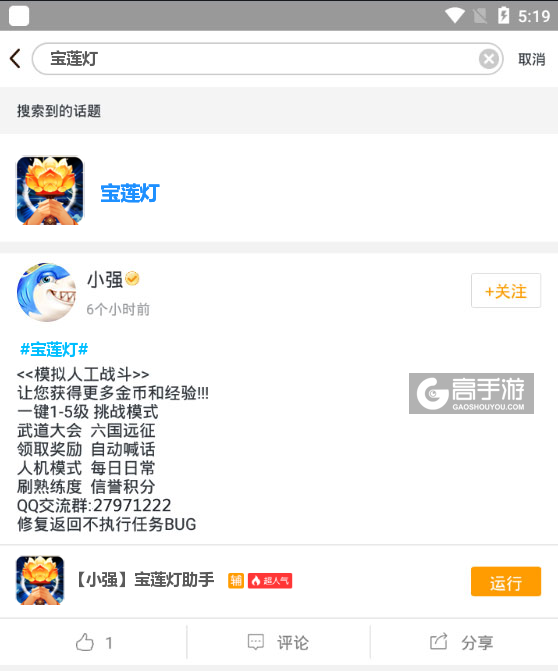 4、切换回首页,在搜索框中搜索“宝莲灯”,点击宝莲灯ICON进入宝莲灯辅助话题页,下方则会出现一系列我们官方工作人员编写的或者官方工作人员审核认证的宝莲灯脚本,您可以根据自己的需求选择对应的脚本,然后点击运行。如图三图四所示。