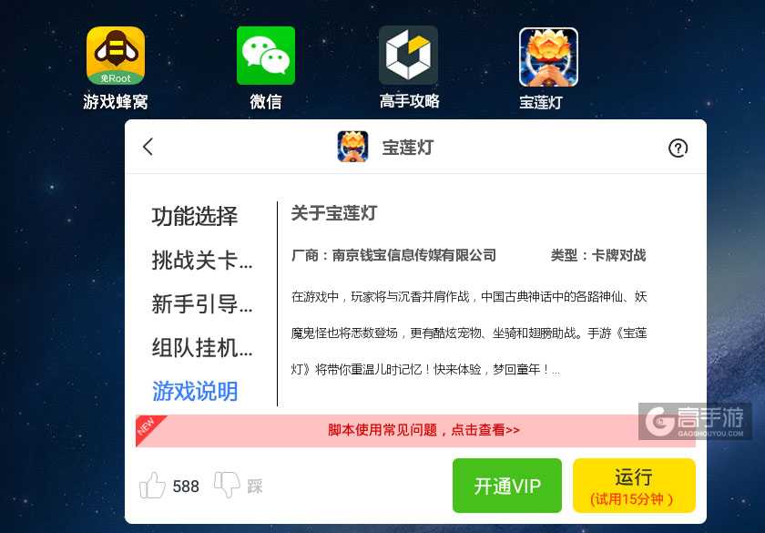 提示:本次下载的宝莲灯辅助工具软件是高手游联合市场排名第一“蜂窝游戏”推出的宝莲灯定制版辅助软件工具,特意针对宝莲灯进行了流畅度优化、性能优化等。