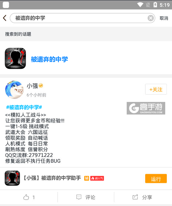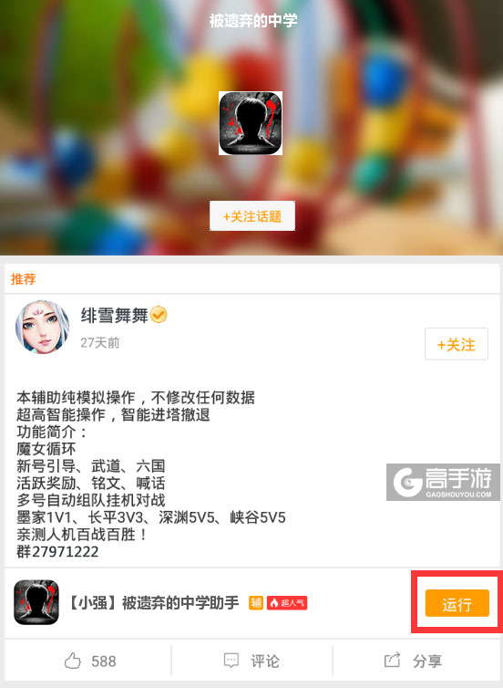 4、切换回首页,在搜索框中搜索“被遗弃的中学”,点击被遗弃的中学ICON进入被遗弃的中学辅助话题页,下方则会出现一系列我们官方工作人员编写的或者官方工作人员审核认证的被遗弃的中学脚本,您可以根据自己的需求选择对应的脚本,然后点击运行。如图三图四所示。