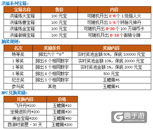 1、宝箱售价100元宝,玩家除获得随机数量道具之外还可获得一个【金鼎卷轴】,凭借此物去NPC处进行掷骰子抽奖。2、玩家可以选择掷6次骰子抽一次,也可以选择一次性掷出6次骰子。3、奖池为永久累计,玩家点击【洪福鼎】即可实时查看奖池金额。4、参与奖和纪念奖奖励为【玉蟾佩】,玩家可凭借此道具在红金宝处选择兑换多种奖励哦!所有奖励一旦中出将通过邮件即时发放!