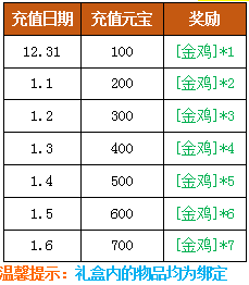 活动内容:活动期间每天充值少量元宝可获得【金鸡】,收集22个【金鸡】可在[玉兔精]处兑换【鸡年礼盒】