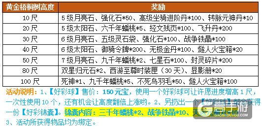 活动内容:惊喜大优惠,活动期间内,灵宝强化所消耗的将会打5折哟,灵宝强化更容易!,还不速速来战!