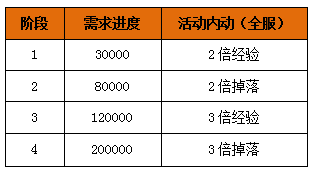 活动内容:活动期间,开启祈福碑玩法。收集[祈福石]前往长安城NPC【祈福碑·圣童】处提交可获得(祈福碑嘉奖状),并可增加本服祈福碑建设进度。当建设进度达到一定要求后,将会开启全服活动,活动及建设度要求对应关系如下: