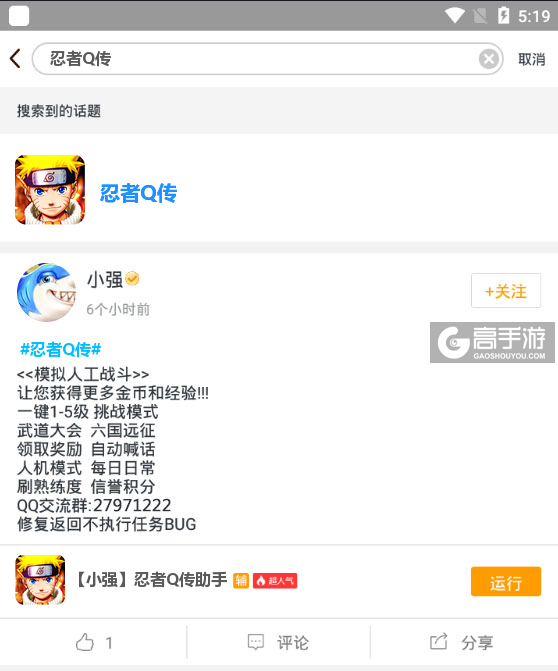 最后,关于此款忍者Q传辅助工具软件如果在使用的过程中有什么不满意的地方或者有需要改进的地方可以关注我们的微信公众号(gaoshouyou)提问或者在下方留言给我们,我们会即时更新并处理。我们会认真对待您的每一条评论,并反馈给脚本作者,以便提升您的游戏质量。