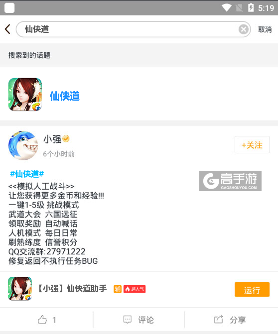 4、切换回首页,在搜索框中搜索“仙侠道”,点击仙侠道ICON进入仙侠道辅助话题页,下方则会出现一系列我们官方工作人员编写的或者官方工作人员审核认证的仙侠道脚本,您可以根据自己的需求选择对应的脚本,然后点击运行。如图三图四所示。