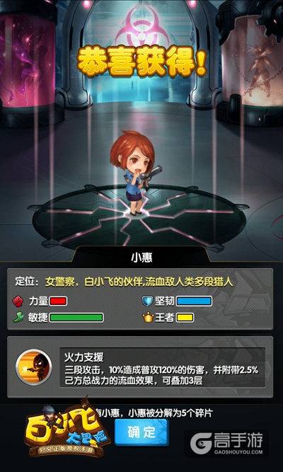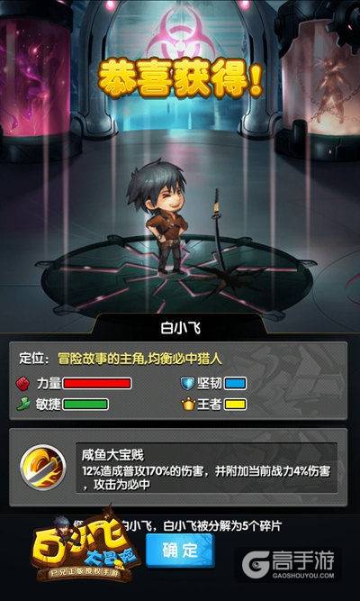 在游戏中,白小飞是重击流中战力最高的卡牌,他的主动技能“咸鱼大宝贱”伤害高,攻击必中。较高的力量和敏捷带来了不错的暴击率和闪避率,同时高王者又带来了高伤害。再搭配上不低的技能触发概率,使得白小飞的主角光环更加耀眼。白小飞的碎片很容易获得,玩家可以轻松将他觉醒至较高品质。