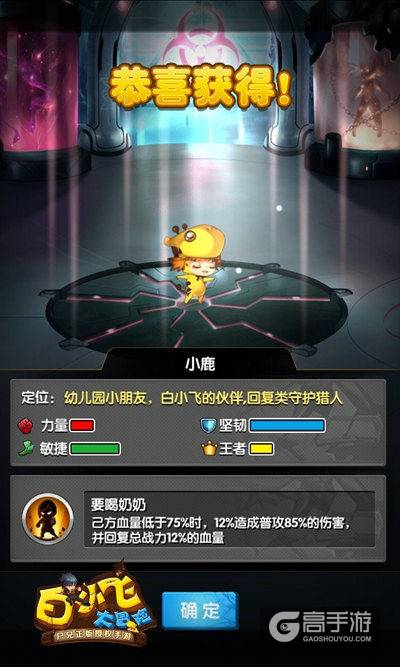 小鹿的形象可爱,但在游戏中可不止会卖萌。作为守护型角色,他有着培养门槛低、恢复力强的优点。玩家在游戏初期即可通过剧情免费获取,后续很多玩法也能获得小鹿碎片,培养起来十分轻松。小鹿的“要喝奶奶”技能可以为己方角色回血,搭配与圣女的合体技“萌萌暖心击”更是可以瞬间恢复大量战力,是白小飞不可或缺的战斗伙伴。