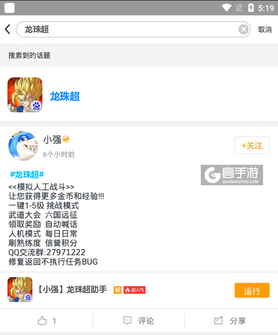 4、切换回首页,在搜索框中搜索“龙珠超”,点击龙珠超ICON进入龙珠超辅助话题页,下方则会出现一系列我们官方工作人员编写的或者官方工作人员审核认证的龙珠超脚本,您可以根据自己的需求选择对应的脚本,然后点击运行。如图三图四所示。
